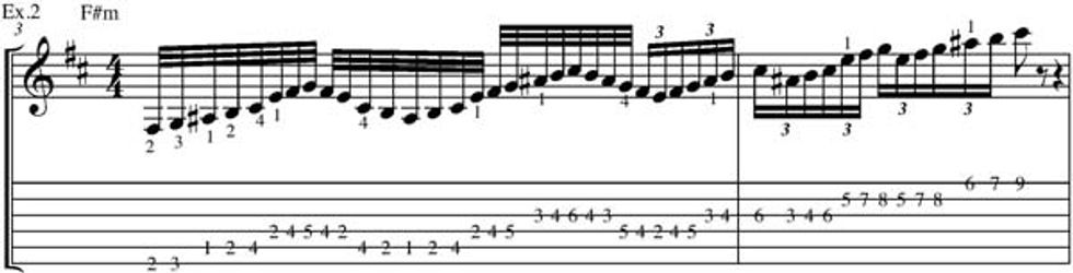 | Ex.2 This example is based off the pattern in example 1a. This example demonstrates how you could apply this to your playing instead of just running up and down the scale. |