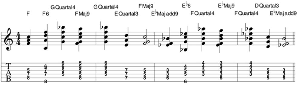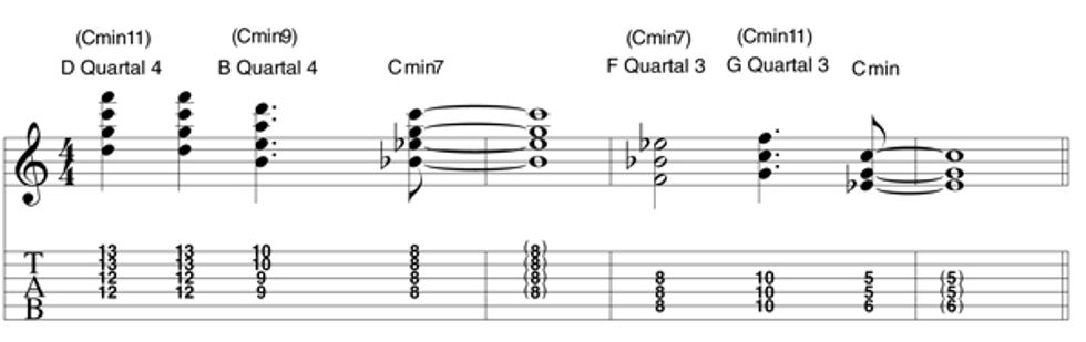 Chords built with 4ths have a sort of rootless character, making them rather ambiguous in regard to key centers. They have no standardized names so we will name them with the lowest note of the chord. If the bass is F, and there are a total of three notes a 4th apart, we will call the chord “F quartal 3.” If there are four notes in the stack, we will call it “F quartal 4,” and so on. Quartal chords can be used to harmonize melodies which would ordinarily be harmonized with a minor chord.