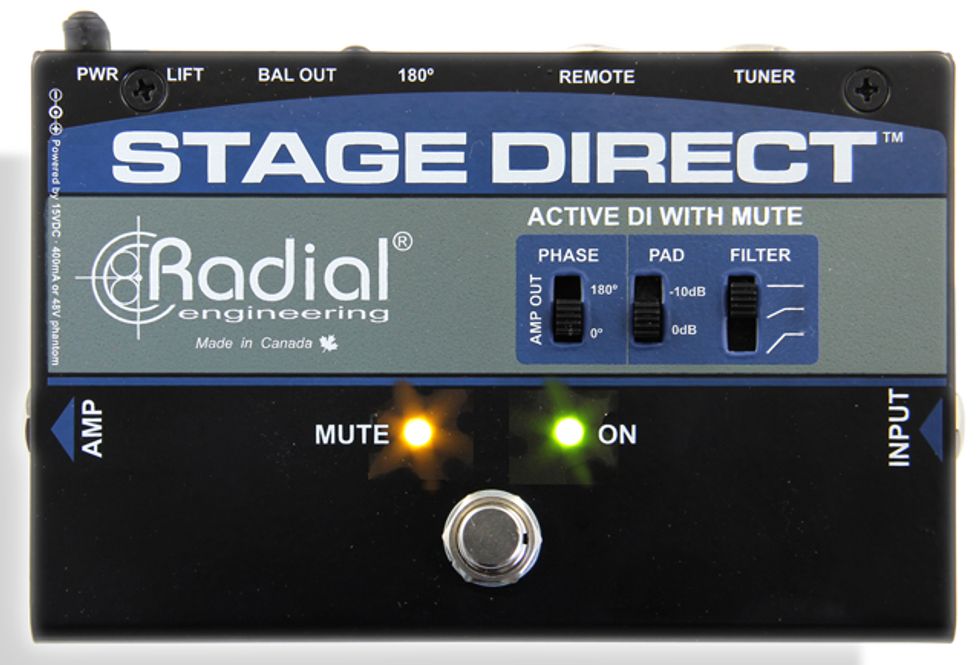 Vancouver, BC (June 24, 2013) -- Radial Engineering Ltd is pleased to announce the StageDirect - a unique direct box that combines all of the standard features one would find in a DI with the added convenience of being able to mute the signal using a footswitch for silent on-stage tuning or to quietly switch instruments without having to turn down the PA system or put the stage amp on standby.