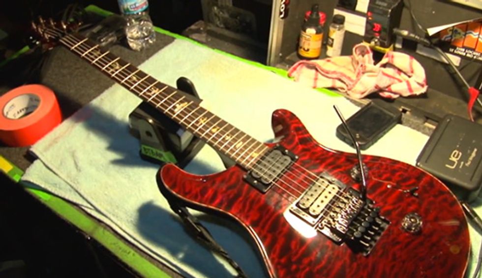 Dustie plays modified PRS Custom 22s built to be lighter weight with obeah wood, and loaded with his signature DiMarzio pickups and a Floyd Rose. Paul plays PRS Custom 24s with Bareknuckle Blackhawk pickups. Both guys tune to C# standard and used custom gauge D'Addario strings: .011, .014, .021 (wound), .032, .044, .056. They use Line 6 Relay G50 digital wireless units.