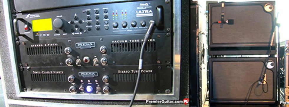 Paul and Dustie's setups are very similar: Fractal Axe-FX Ultras through Mesa/Boogie stereo power amps. Dustie uses a Stereo 2:100, while Paul uses a Simul-Class 2:90. Both have Stereo 2:50 units for backup. The Mesas power two Port City 212 cabs (each) that are running in stereo and have Celestion Vintage 30s.