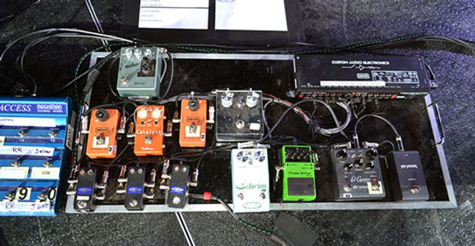 Corgan uses a Rocktron All Access switcher (left, not pictured) to switch between his Salvation Mods modules. For pedals he uses a Skreddy Echo (the closest to his preferred vintage Binson Echorec), two MXR Phase 90s used for solos, a Fulltone Catalyst used as a preamp, a Chicago Iron Octavian, a Boss PS-2 Phase Shifter, and a Strymon El Capistan. The only other pedal on the board is a custom pedal he calls the Bloody Finger, which is made by a company that is now out of business. Corgan calls it the best solo pedal he has, saying it sounds like Brian May's Queen tone but with more gain. He uses Keeley loopers to take pedals in and out of the signal, explaining that 90 percent of the show is just the guitar and amps.