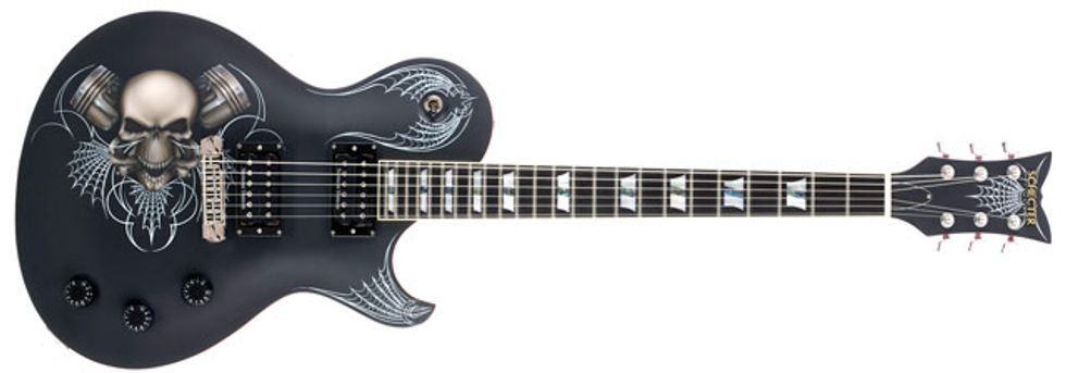 The guitars striking two-tone finish features a satin ‘Skull & Carbs’ hotrod graphic with glossed metallic red sides and back.