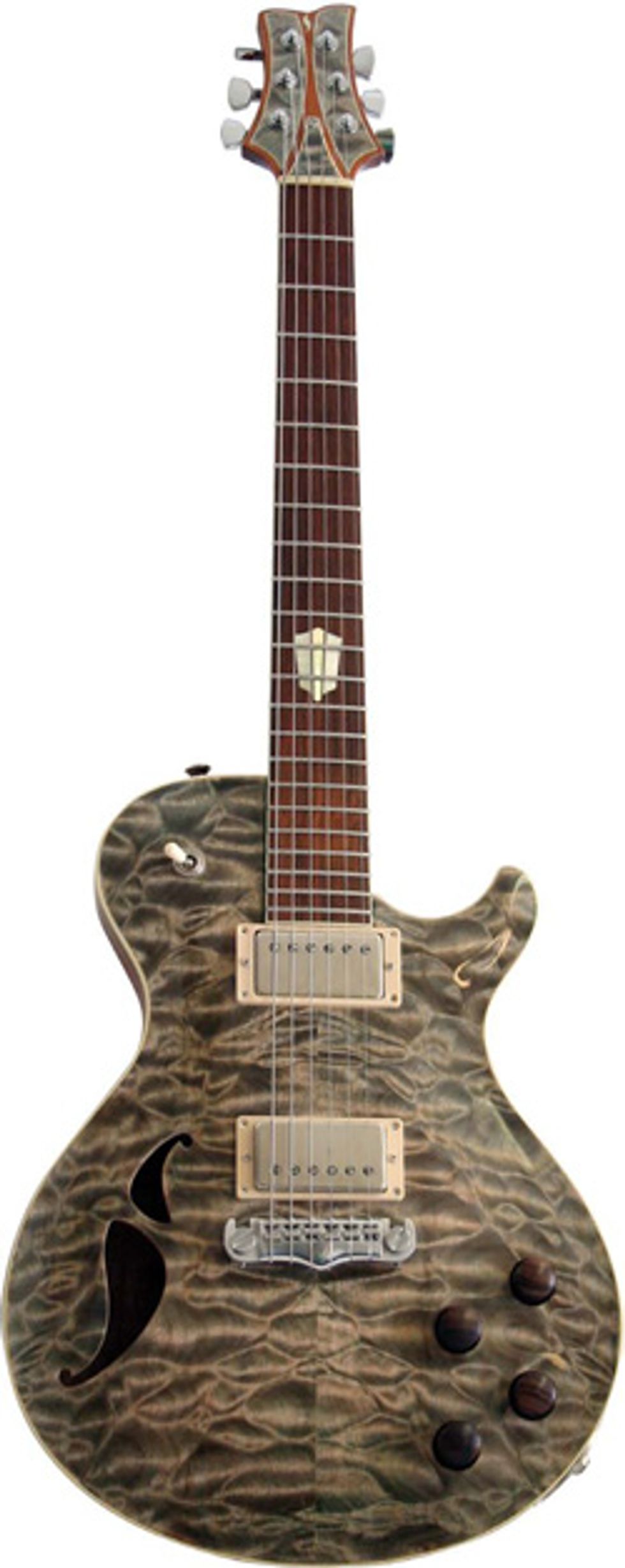 The Schroeder-designed aluminum bridge features fully adjustable stainless steel saddles, clips and screws. The bridge attaches to the body in traditional twin mounting stud fashion, and the chrome strap buttons feature protective bushings that match nicely with the clever “S” shaped, side-mounted input jack (talk about brand extension). The set neck attaches to the body at the 16th fret, which is consistent with this body style, therefore upper fret access on the lower strings requires some hand gymnastics. The 1.73" wide bone nut is finely cut and polished, with its edges smoothly honed. The chrome Sperzel locking tuners are well seated and add to the guitar’s classy appearance.