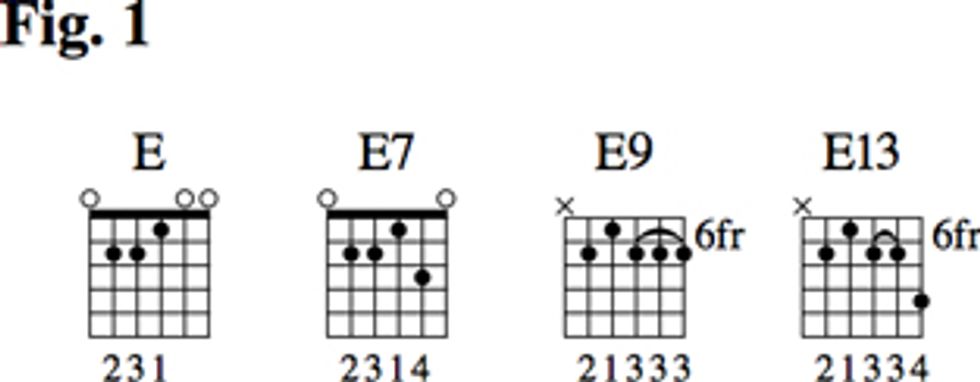 To play rhythm, you’ve got to know some chords, so that’s where we’ll start. One of the core things that separates uptown blues from other styles of blues is the harmony. In other blues styles, the prevailing harmony tends to be built with triads or dominant 7 chords. In Fig. 1 you can see a basic voicing for E and E7 and then we expand those to include the 9 and 13.
