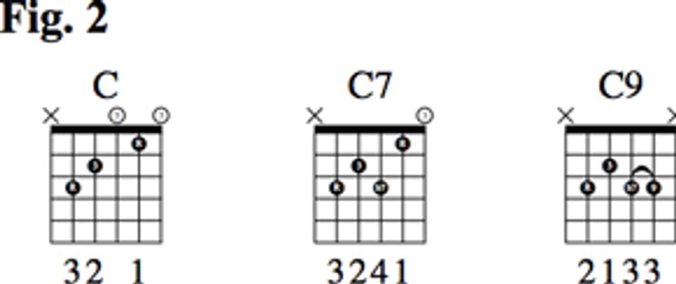In Fig. 2 you can see that two adjustments are needed to turn a basic C chord into a C9 chord.