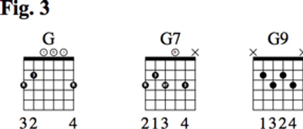 Here’s how to arrive at a very useful 9th chord shape from your basic G major chord, shown in Fig. 3. First, we replace the open D on the 4th string with the F note on the 3rd fret, giving us the b7 needed to make a dominant 7 chord. We’ll also eliminate the 1st string and then play the 5 on the 2nd string instead of the 3. In the second step, we’ll substitute the 9 for the 3rd string root and skip the low root altogether. This is a common substitution, as the root doesn’t provide as much interest as the 9, and if you’re playing with a bass player, the root tends to be covered.