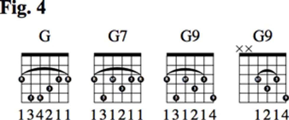 In Fig. 4, you’ll see how we can get to a hip voicing for a dominant 9 chord from our beloved major barre chord. We start with the basic shape at the third fret. From there, we drop the root on the 4th string two frets to get the b7. Then we add the 9 on the 1st string with our pinky. Now that all the notes are in place, we drop the root and 5 on the lower two strings to come up with a rootless voicing for G9. You could certainly play the barred version of the chord, but removing the bottom two notes gives more sonic separation from the bass player.