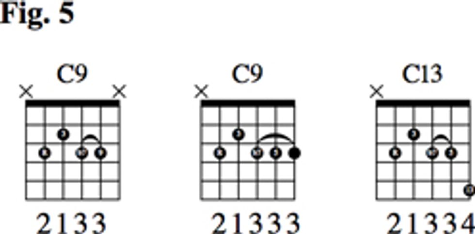 Let’s take our newfound C9 (from Fig. 2) and expand it to a dominant 13 chord in Fig. 5. We start with our original shape and then extend our 3rd finger to cover the G on the 1st string—that’s the 5th of the chord. Next, we replace that note by moving it up two frets and hit the A at the 5th fret with our pinky. Remember, the 13 is the same note as the 6, just up an octave. So by moving a whole-step up from the 5, we arrive at our 13.
