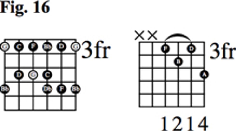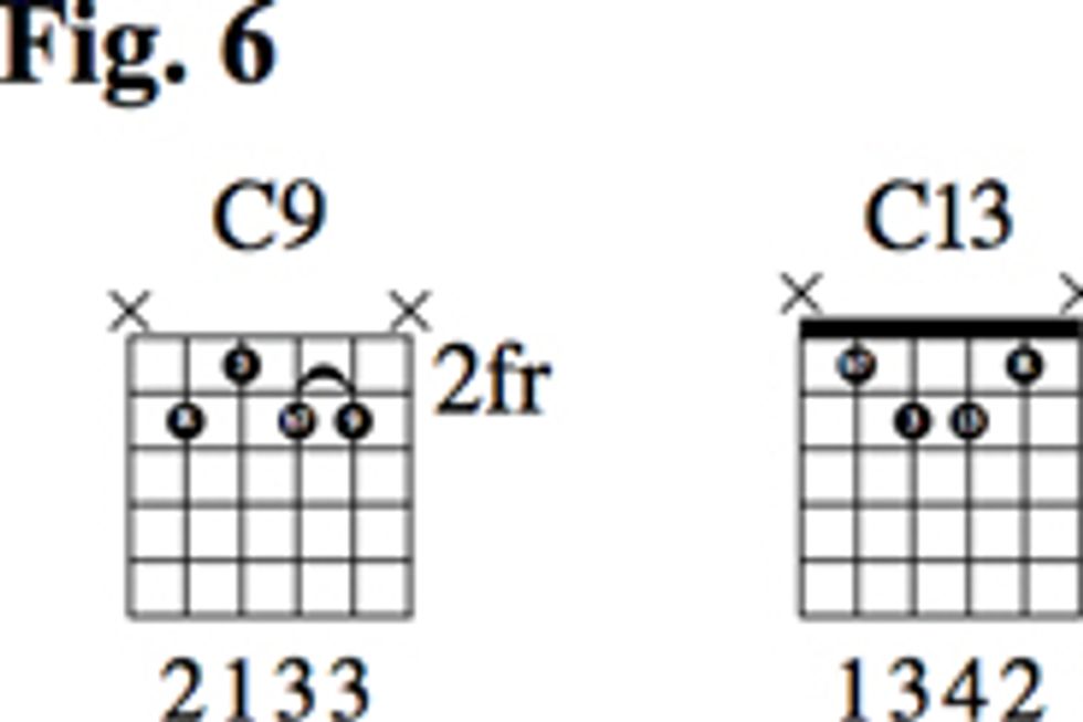 Let’s look at another option in Fig. 6. We start with the same C9 voicing as before, but this time we lower both the root (on the 5th string) and the 9 (on the 2nd string) down a whole-step.