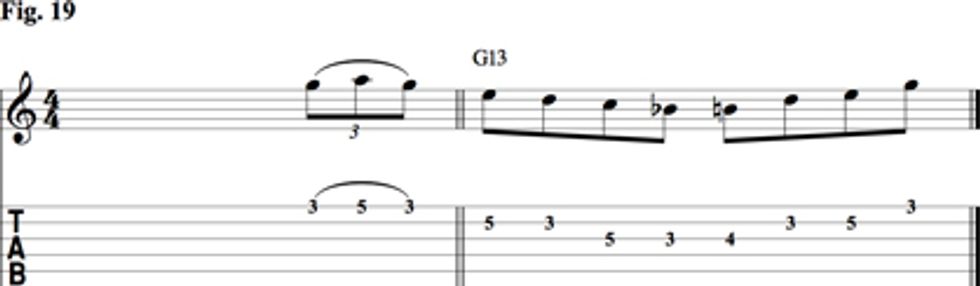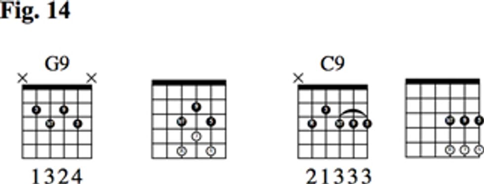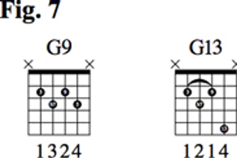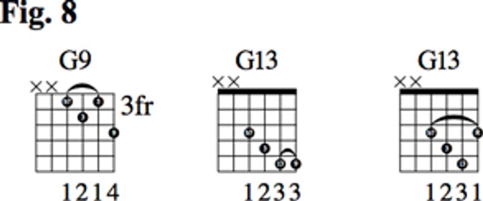 Once again in Fig. 8, we’ll use the 13-for-5 substitution to arrive at a G13. You can decide whether or not to include the 9 in this 13th voicing.