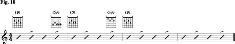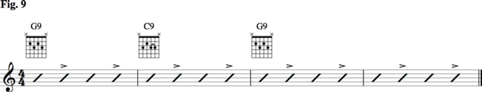 Let’s add some rhythm to these chords. The first rhythm accompaniment pattern we’ll look at is referred to as “four to the bar,” shown in Fig. 9. Keep the quarter-note pulse throughout the progression while emphasizing beats 2 and 4. This feel is common to swing and jazz. Freddie Green was a master at this feel. Check out recordings of him with Count Basie.