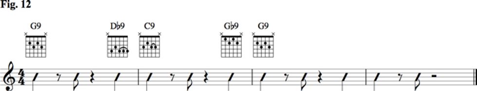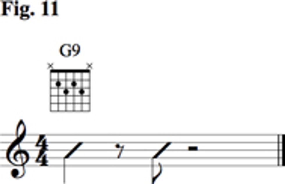 For these next examples, think about the sound of a horn section. Horn sections are often a part of bands that have an uptown sound. With 9th and 13th voicings you can imitate the sound of a horn section; Fig. 11 and Fig. 12 present a few rhythms used to convey that sound.