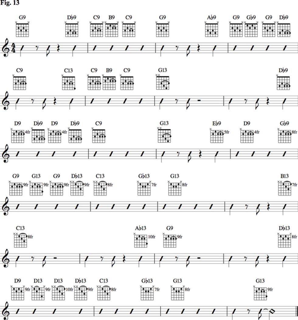 Now we’ll put all of this together in Fig. 13. By utilizing multiple voicings of the 9th and 13th chords—and moving them around by either a half- or whole-step and applying various rhythms commonly found in swing and jazz music—we’re able to create a sophisticated accompaniment to the basic blues progression.