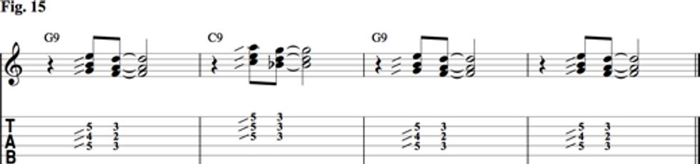 The final accompaniment strategy we’ll explore is a technique often referred to as the “sliding 9th.” If we take the 9th chords in Fig. 14 and slide the top three strings of each voicing up a whole-step, the chord becomes a 6th chord. Remember, the 6 is the same as the 13. This move is very effective in adding harmonic color to your accompaniment. Fig. 15 demonstrates this technique over the first four measures of a blues progression.
