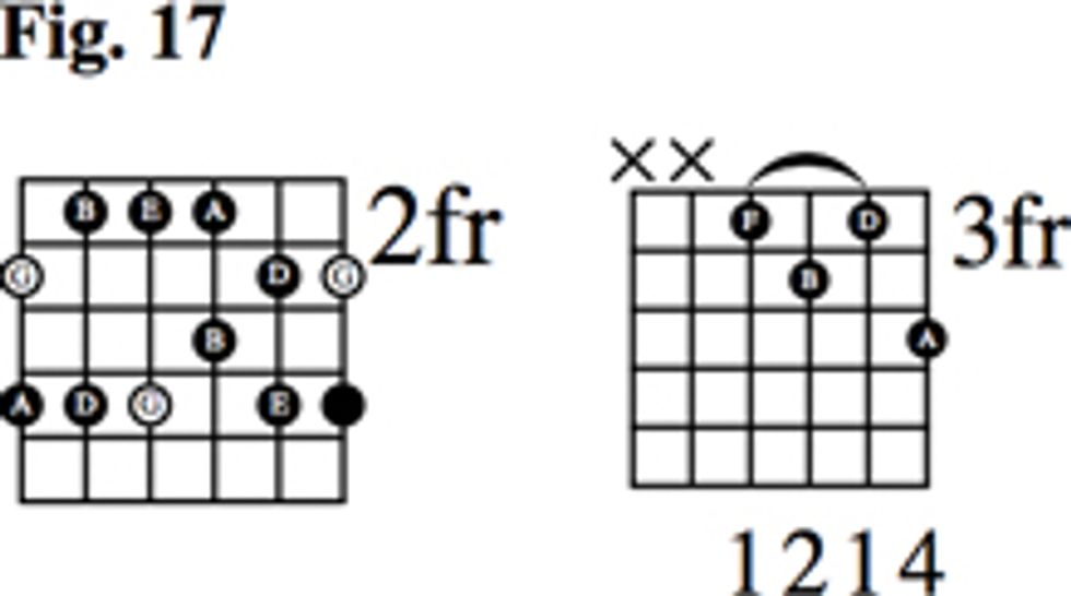 In Fig. 7, we’ll use the 13-for-5 substitution to arrive at our G13 voicing. Barre across the second fret with your first finger to allow your pinky to reach up for the 13 on the 2nd string.
