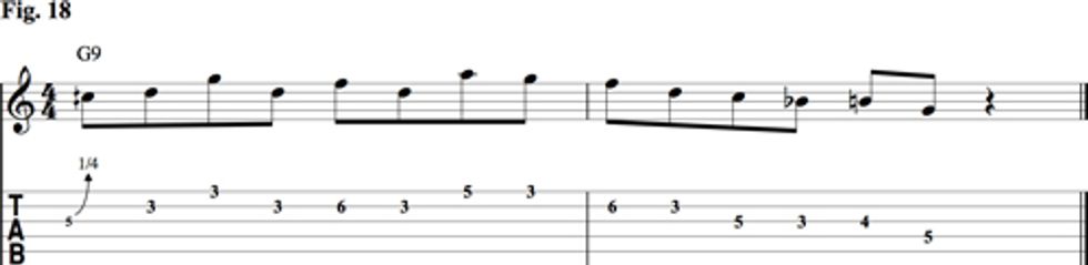 Players such as T-Bone, Johnny Moore (who played with Charles Brown), and Tiny Grimes had a knack for highlighting the interesting notes of the chord at the appropriate time—getting inside the chord. The blues scale doesn’t have all the notes needed to pull this off. For example, say we’re playing an uptown blues in G using the G blues scale (G–Bb–C–Db–D–F) over a G9 (G–B–D–F–A) chord. You can see in Fig. 16 that the scale doesn’t include the 3 or the 9 of the chord—two very useful sounds.
