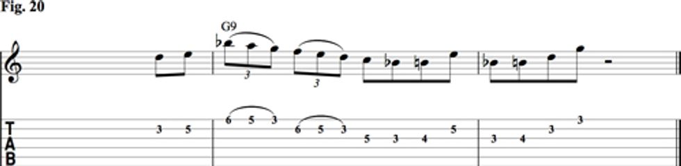 Fig. 20 was played by Tiny Grimes on “Tiny’s Tempo” recorded with the great saxophonist Charlie Parker. The lick begins at about 2:24 in the video below, but I have transposed it to the key of G to work over the G9 chord.