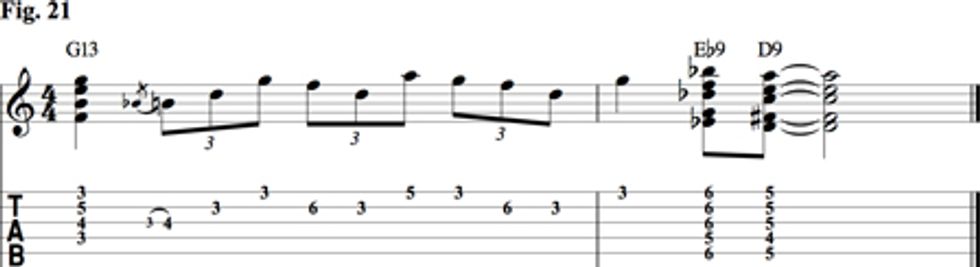 The phrase in Fig. 21 incorporates chord hits, half-step chord moves, and adds the sound of the 9 over the G13 chord. It can be used as a turnaround at the end of the blues form.