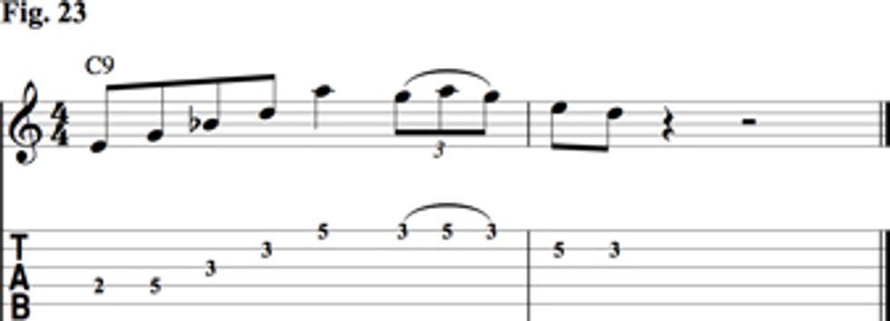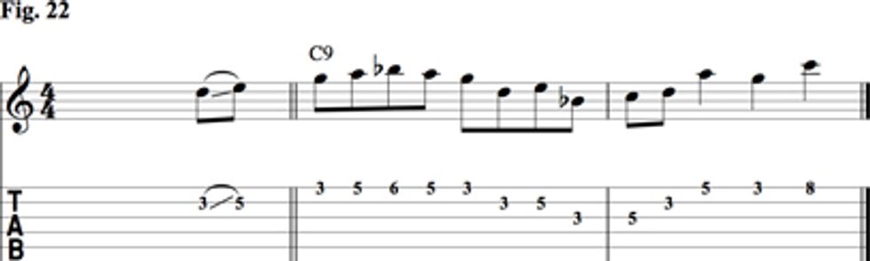The final two licks are based out of the C9 shape in Fig. 14. Fig. 22 is a Charlie Christian lick from the “Seven Come Eleven” recording mentioned earlier and includes the 9 and 13. I transposed it to C to fit over the chord.
