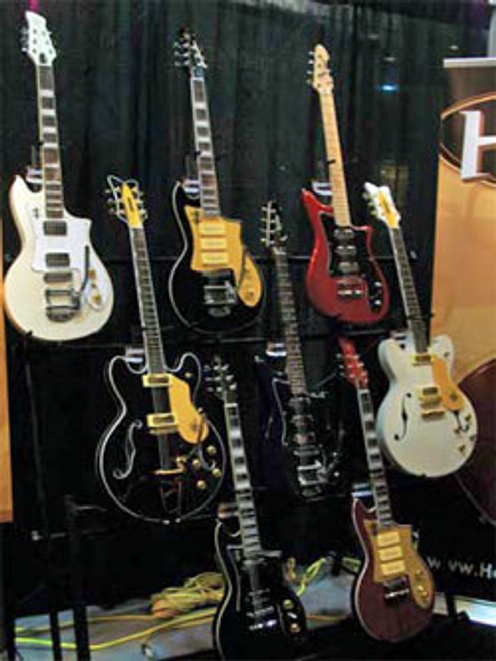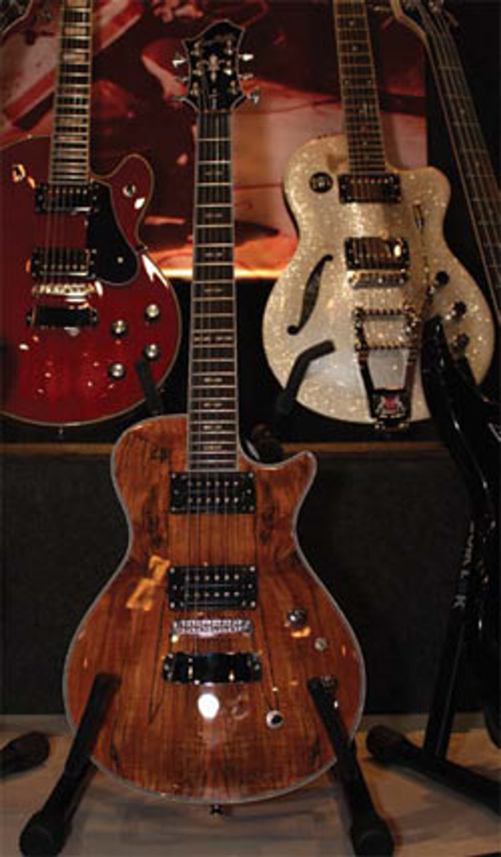 Hagstrom Hagstrom has been making guitars again for several years now since taking a 20-year hiatus. Their Ultra Swede has a basswood body with a flamed maple top. The 24.75ā scale guitar comes with custom-wound humbuckers and the companyās ultra-thin UltraLux neck. An Ultra Swede with a spalted maple top was shown at NAMM. Also catching our eye was their semi-hollow Viking and a silver sparkle Deluxe F-Tremar with the companyās new Tremar rocker vibrato bridge. Ultra Swede - Street $484 hagstromguitars.com Watch our booth interview |