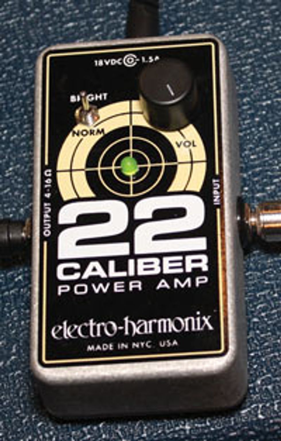 Electro-Harmonix 22 Caliber Power Amp Howād you like to fit an ass-kicking amplifier into your front pocket? Thatās what you can do with the Electro-Harmonix 22 Caliber power ampāitās the size of a small pedal, no kidding. Okay, technically the power supply (18V 1.66A) is built into a power cord, much like that of a laptop computer, but stillāwe were knocked out by what the 22 Calliber puts out, poundper- pound. This little beast is 22 watts and very loud. It handles 4, 8, and 16 ohm speaker loads automatically. The 22 Caliber covers a lot ground with just a bright switch and a volume knob. The diminutive amp is expected to cost about $100. MAP $99 ehx.com Watch our booth interview & demo |