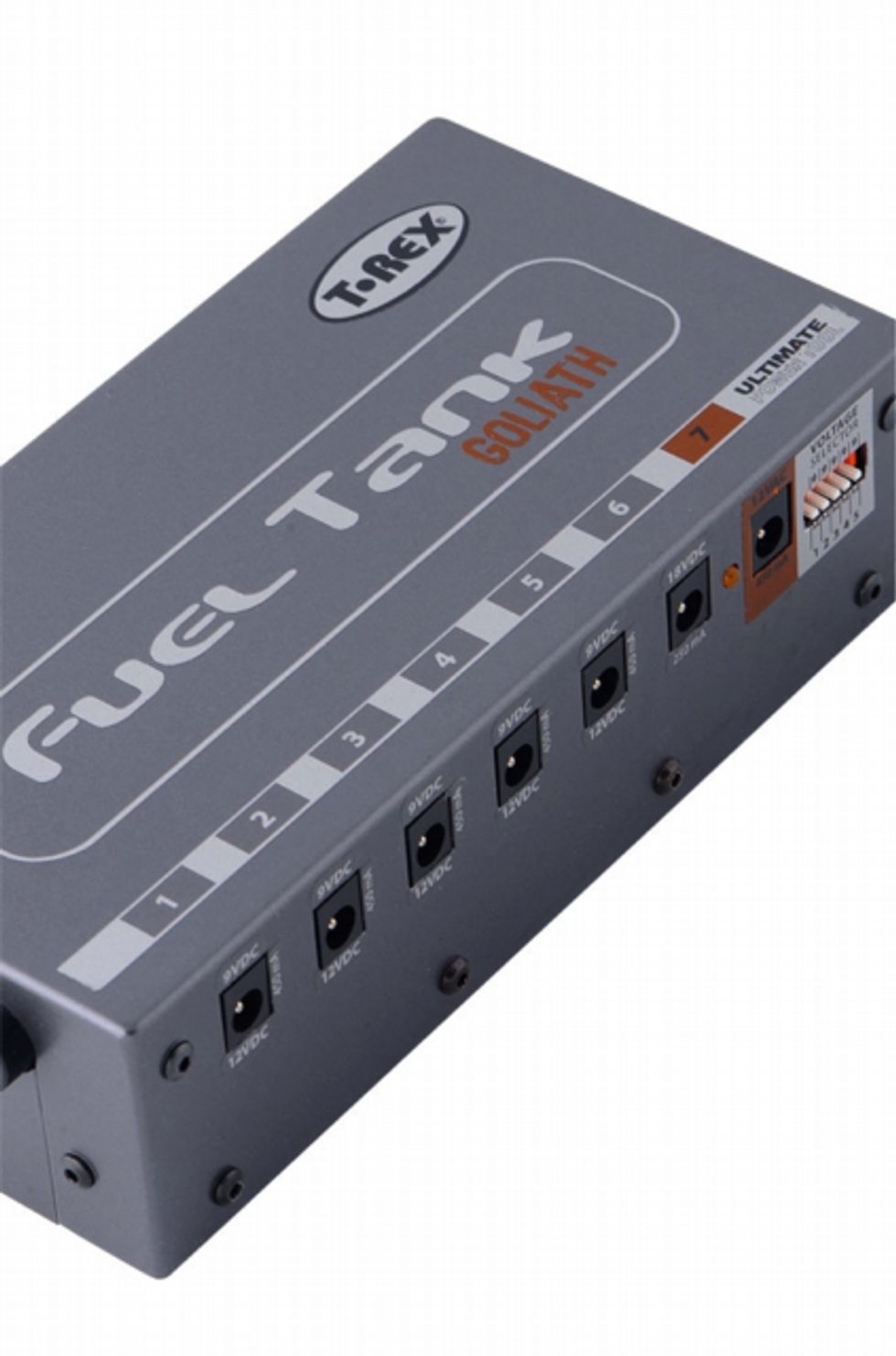 Fuel Tank Goliath (Retail: $399/Street: $299)- With 7 isolated outlets and the ability to handle 9, 12 and 18 V DC pedals plus a 12 volt AC, the new Fuel Tank Goliath will power almost every pedal you own… and then some. Each of Goliath’s five standard outlets delivers a mammoth 450mA of switchable 9 or 12 volt power – which is enough to keep even the most demanding T-Rex pedals pumping out pure tone. On top of that, you get an 18 volt DC outlet (250mA) and a 12 volt AC outlet (450mA), for a wealth of ferocious T-Rex power. That’s nearly 3000 mA of simultaneous power – our mightiest power supply ever! Plus, Goliath features a 115V/230V voltage selector, making it conveniently compatible overseas for touring musicians. North America availability: June 2013