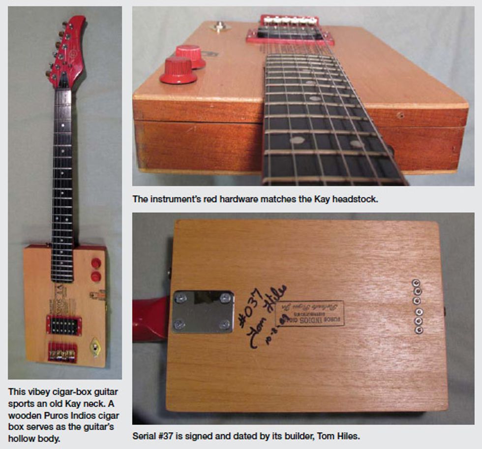 So I bookmarked the auction and checked on its status each day until—after repeated viewings—I knew I just had to have it. So I sniped in the last few seconds and snagged it for $107 plus $25 shipping. When the guitar arrived, I just marveled at its construction: It had a Strat-style bridge with six individually adjustable saddles, a humbucking pickup, Volume and Tone controls, and a jack mounted on the face of a wooden Puros Indios cigar box. How cool is that?