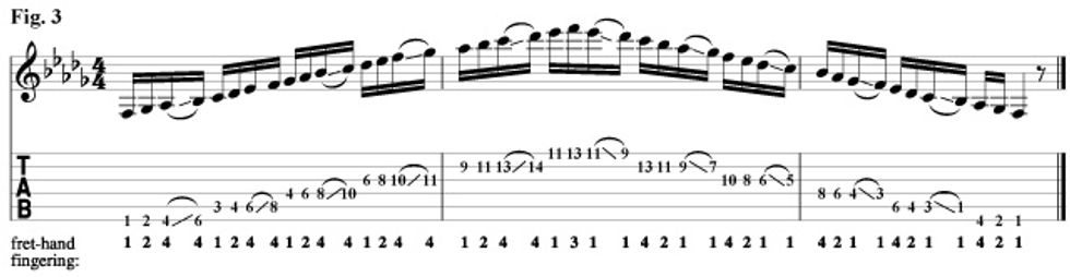 Ex.3 This next one is F Phrygian (F – Gb – Ab – Bb – C – Db – Eb). This one is trickier descending than ascending. You can always modify the fingering so they are more comfortable. Try using 4 fingers on one string for some of these and be sure to experiment. Download Audio Example.