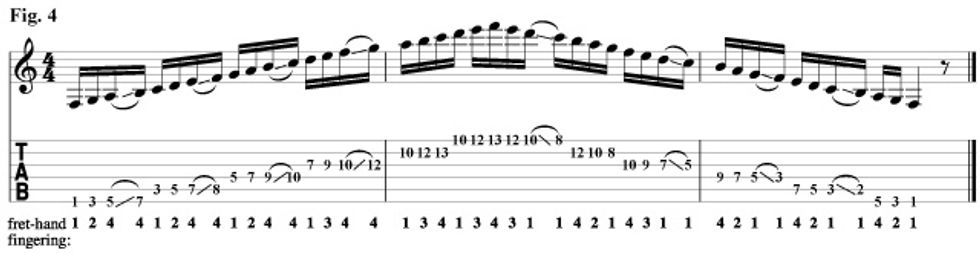 Ex.1 This fingering is for a F major scale (F – G – A – Bb – C – D – E) played across the fingerboard. When you ascend up these scales be sure to slide your pinky and when you descend slide your first finger, I'm picking all 4 notes on a string. Also, I gave you a few suggested fingerings you could try. Download Audio Example.
