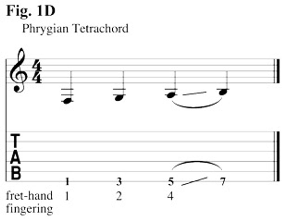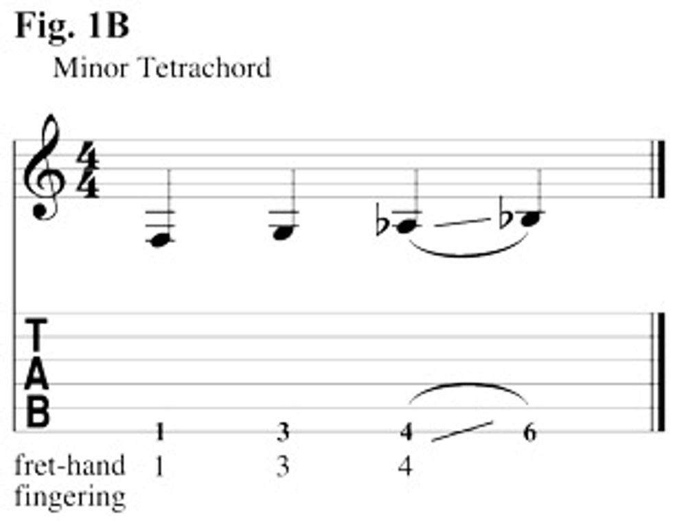 Ex 1a-1d If you look at these examples you will see the four main patterns (major, minor, Phrygian and Lydian) of tetrachords. If you are not sure what this means, the major tetrachord is built from the first four notes of a major scale, you could look at it as whole step/whole step/half step. The minor tetrachord is built from the first four notes of the minor scale or whole step/half step/whole step.