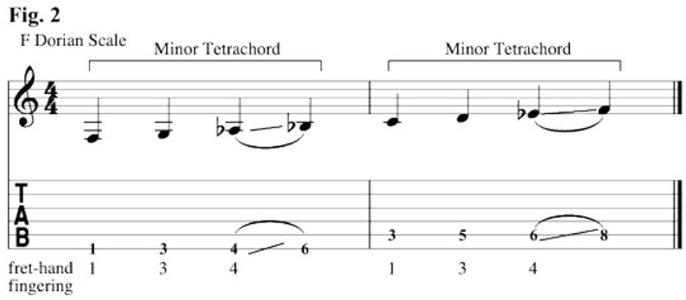 Ex.2 If you look at the F Dorian pattern, it is constructed with two minor tetrachords separated by a whole step. This pattern can be applied to all keys to create a Dorian mode. You can also think of it as the first tetrachord is off the root and the second one is built off the 5th.