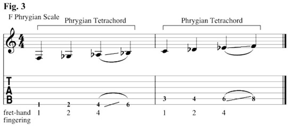 Ex.3 The F Phrygian is constructed with two Phrygian tetrachords separated by a whole step. Each Phrygian tetrachord is built half step-whole step-whole step.