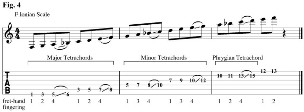 Ex.4 Here is an extended F Ionian scale (F–G–A–Bb–C–D–E). I labeled the names of the tetrachords above so you can see how this extended pattern is constructed. This extended pattern is built with two major tetrachords, then two minor tetrachords, then a Phrygian tetrachord. Since we are stopping at the high F, we are only using one Phrygian tetrachord and part of another, basically. If you keep going it would be two Phrygian tetrachords. Like the extended patterns in the previous lesson I'm picking all four notes on a string and sliding up with my pinky finger.
