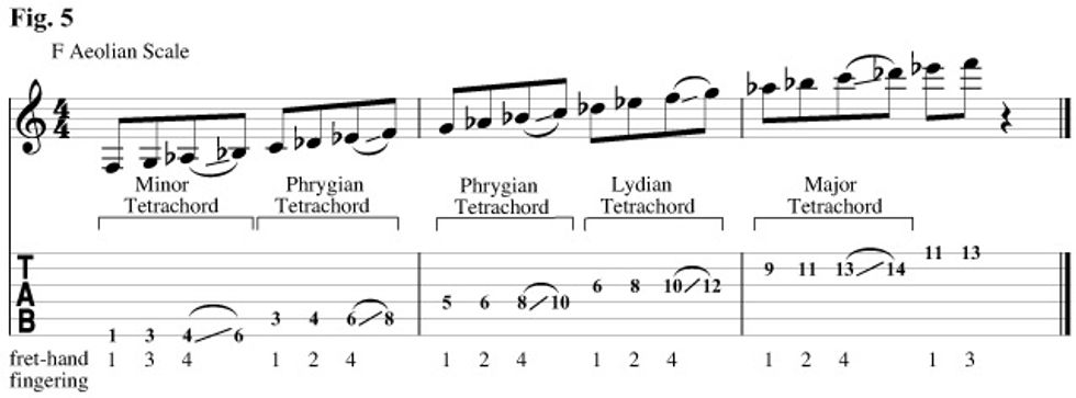 Ex.5 Lets take a look at this extended F Aeolian scale (F–G–Ab–Bb–C–Db–Eb). It is built with a minor tetrachord, two Phrygian tetrachords, a Lydian tetrachord and a major tetrachord. If you continue, the pattern of tetrachords will be the same.