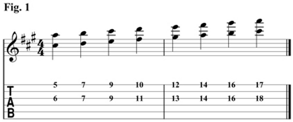 In Fig. 1 will be working with the interval of a sixth. We will start in the key of A with the root on the 1st string and the third on the 3rd string. Once you can recognize the pattern moving up and down the neck, transpose this to the other eleven keys.