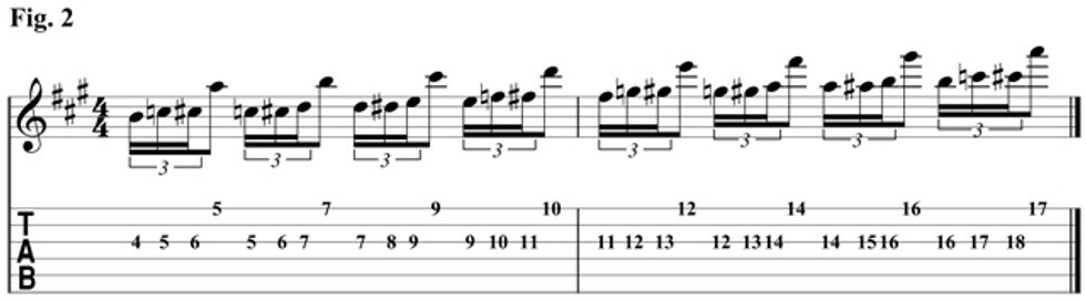 We will incorporate some country guitar concepts in Fig. 2. Here, we will approach the lower note chromatically from a whole step below. To get the chicken picking sound, you'll need to palm mute the first three notes and pluck the high note of the interval with the middle finger.