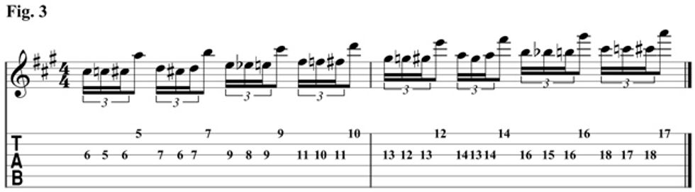 At first glance, Fig. 3 looks very similar to the previous example. In this lick, instead of approach the lower note chromatically, we add a lower neighbor tone to keep the symmetrical movement going.