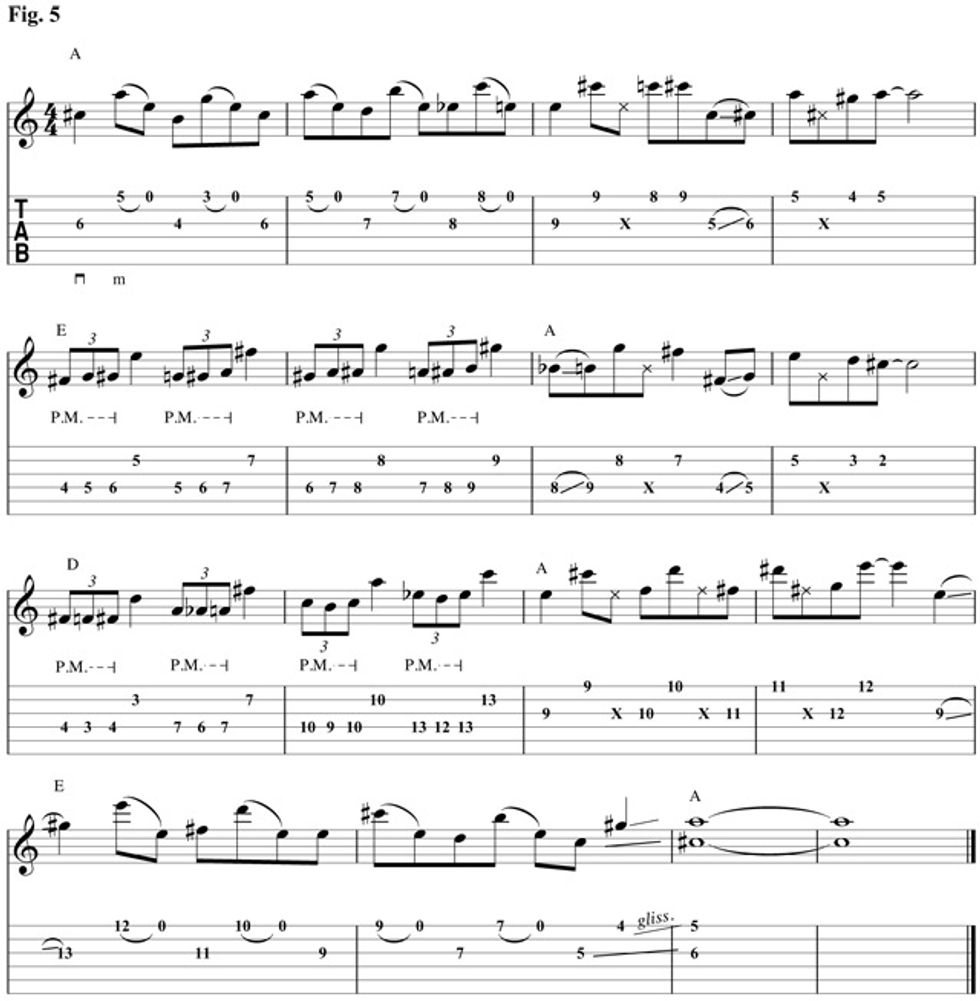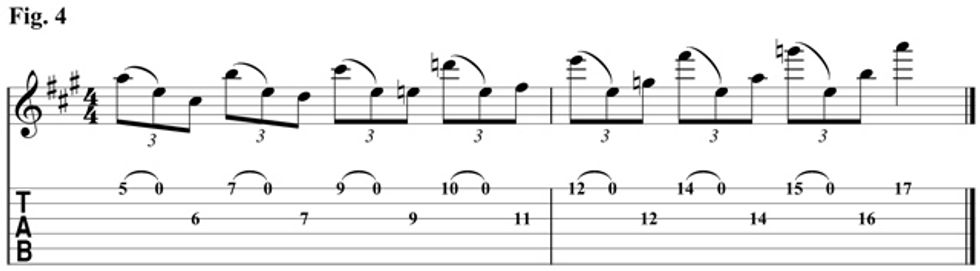 We put everything together in Fig. 5. This example combines the open-string pull offs with moving up and down the neck in sixths. Start things slow and listen to the audio example to really hear how these examples work in context.