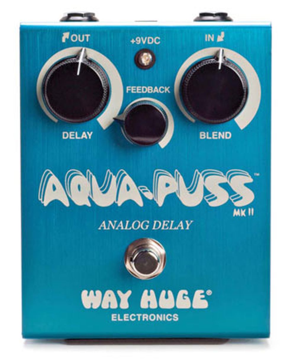 So there I was, years later, entranced by its incredible sound—having paid much more for a used one than the original cost new. Alas, I eventually needed some new wheels, so I sold the pedal to make a down payment on a car. Think about that for a second: the price I sold the used pedal for was enough to make a down payment on a new car. Such is the tale of supply and demand, something the story of the original Way Huge line certainly illustrates. In comparison to the massive numbers of effects produced today, the original Way Huge line was manufactured in mere handfuls. As word caught on, the used prices skyrocketed—up to thousands of dollars in some cases. That demand alone is what prompted the resurrection of Way Huge, which now has Jeorge Tripps back at the helm. The reissue of the Swollen Pickle Jumbo Fuzz was massively popular, and now the release of the Aqua- Puss MkII Analog Delay seems ready to attain similar popularity.