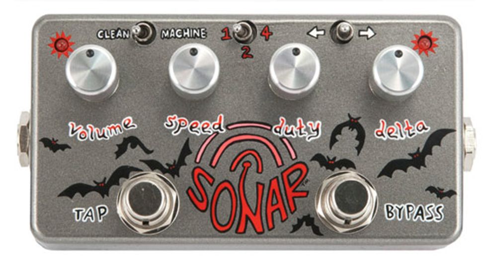 2] Machine tremolo with tap tempo, selected with the clean/machine switch. All of the above features, but the Machine pedal sound is now pulsing out of the Sonar. Just imagine how that will sound coming out of your higher-gain amp. If you’ve ever experienced a machine going through a fuzz or distortion, you’re aware of just how searing it sounds. This was the original intent with the Sonar, to give users who like dirty basic sounds the ability to sound more “penetrating” with a tremolo. Like the original Machine, the Sonar’s internal machine decays and creates that hazy rotating sound as the trem pulses on.