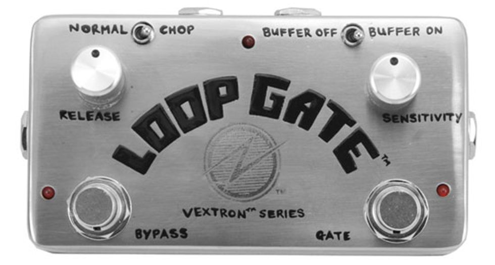 BUT WAIT, that’s not all. There’s a small switch to select “chop” mode, which holds the gate open for a specific time set by the release knob, and suddenly slams shut. It won’t open again until the same period of silence has elapsed, so you can get a very interesting effect by letting your guitar sustain, where the loop gate opens and releases a blast of sound in a rhythmic pattern just like a tremolo except for one thing... you can stop playing at any moment and start again, and it will reset the start point. This is very useful for locking up the timing with the band, if you’re trying to get the tempo just right. Say the band has drifted back in tempo, and your release setting is now a little too fast. As soon as your pulses begin to creep ahead of the beat, just stop playing for a moment (say, just before 1) and start in time, and it will start with you the moment you play. Being able to bring in a whole loop of pedals with a crazy sound that is being pulsed at a precise rate and suddenly make it disappear by hitting one bypass button is very very handy for creating intense textures that need to come and go without having a switching system. While the loop is disengaged, of course, you can switch on and off pedals in the loop at your leisure, and by switching off the gate (there’s a stomp switch for that), use the bypass switch to bring the loop back in at any time.