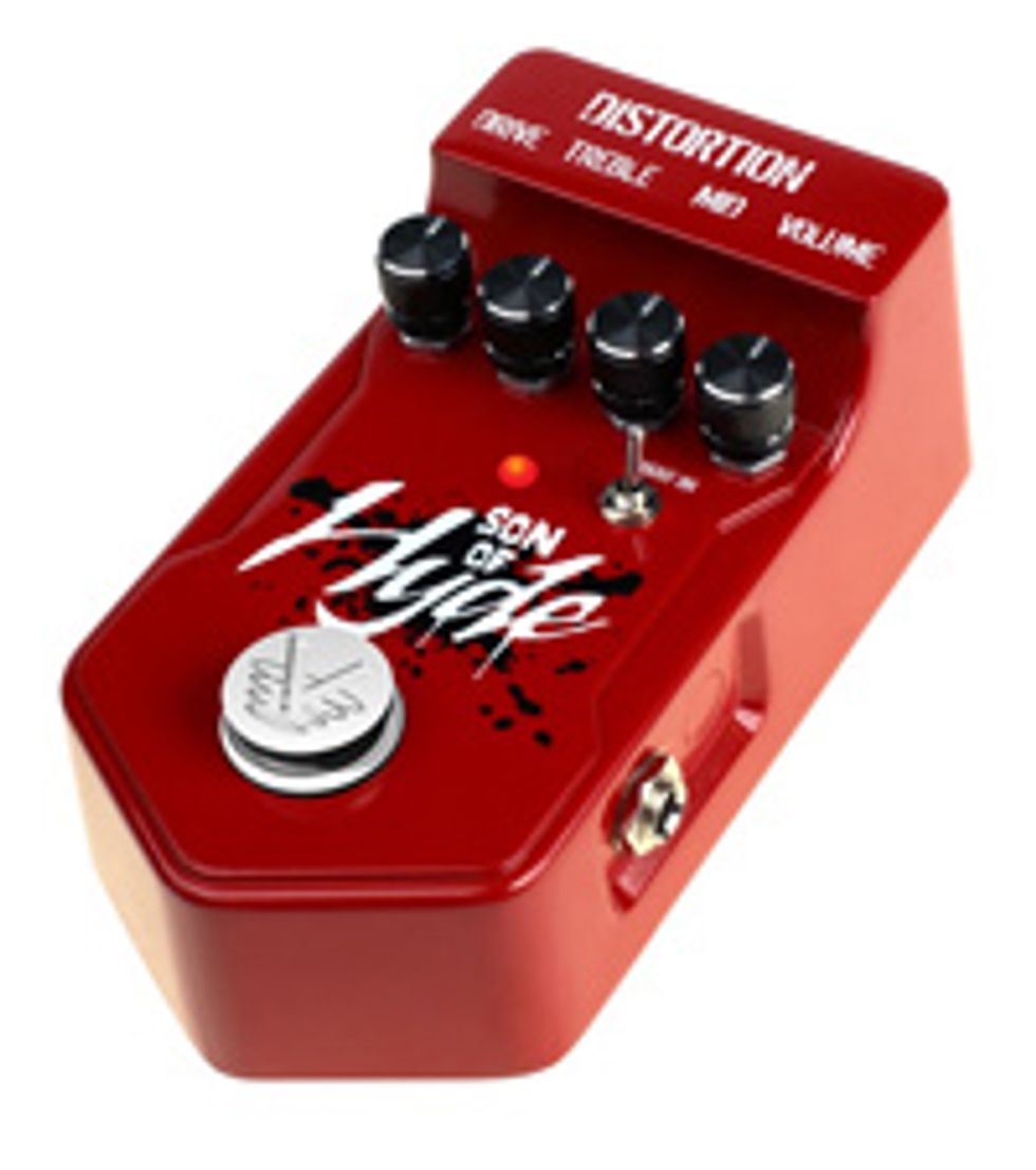 By Michael Ross The Son of Hyde is the exact same distortion sound found in Hyde side of the Jekyll & Hyde pedal. It differs from the Route 808 largely in that it exhibits a British voicing to the more American 808, and sounds less compressed. This pedal also offers more gain, as well as Treble and Mid controls (as opposed to Tone only), and a Bright switch that replaces the overdrive’s Bass Boost. Though labeled a distortion, the Son of Hyde functioned fine as an overdrive in lower gain settings. Set with the Drive at 10 o’clock or below, and the Mid control likewise, the pedal turned into a dynamic, edgy, modern, blues machine that cleaned up nicely when the instrument’s volume was backed off. Goosing the gain and the midrange created some screaming classic sixties tones. With the Drive all the way up and the Mid all the way down, the Son of Hyde implied some modern metal sounds, but it probably doesn’t have enough over-the-top gain or mid-scoop to satisfy one’s inner Slipknot. What Son of Hyde does have is a noise gate that suppresses any hint of hiss when you stop playing, even at the highest, brightest distortion settings. It also produced enough low end to rattle the walls—engaging the Bright switch reduced this a little, leaving just enough bass to re-arrange my internal organs. Hard rockers and mild metal-heads would do well to check out this little monster. Buy if…
