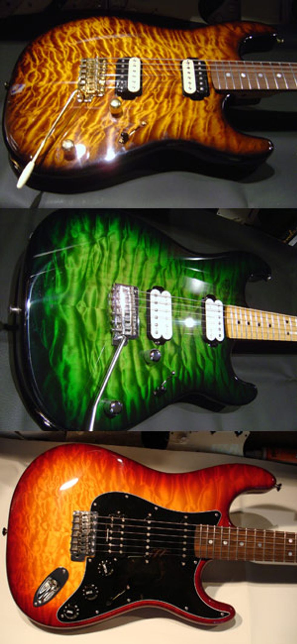 "I have tried most [pickup] manufacturers cold and hot. For singles I like Seymour Duncan Custom calibrated set of Alnico 2: 6.5, 6.5 (RW Middle),6.5. MJ knows what she is doing and is great to work with. The John Suhr v60 LPs are equally as awesome for single coils. I have never tried a BurstBucker in a Strat, so I stick with Seymour or DiMarzio humbuckers. I like the five-way Superstrat wiring where you take two humbuckers and split the north coils on position 2 and the south coils on position 4. Since the pickups are reverse of each other this makes all five positions humbucking. I usually use a hi-pass filter on the volume so it rolls down clean and sparkly.