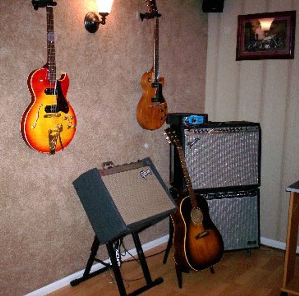 "My collection (and noise) was outgrowing the guest room of our house, so my wife and I decided I should build a separate room from the house just for playing and displaying the guitars and equipment. So we found a place next to our house and the work began. First, a slab floor was poured; then concrete block walls were erected. A handyman and I did the rest. The room has a reinforced fiberglass door with a steel outer door, an alarm and monitor cameras for my peace of mind (we also have two 200 lb. Mastiffs). It has no windows, two small skylights and is climate controlled. Apart from the alarm and video cameras, I can also monitor the humidity, temperature and I am alerted of a fire from the inside of the house."