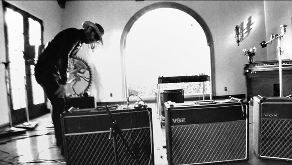 Few producers have made a sonic imprint as deep as Daniel Lanois, whose signature approach—complete with mysterious colors—is at the core of great records by U2, Bob Dylan, Peter Gabriel, and Emmylou Harris, among many others. As a player, Lanois has a singular, understated approach to both the 6-string and pedal steel. And as evidenced by his latest solo album, Flesh and Machine, he has the uncanny ability to extract new sounds from his goldtop Les Paul, Sho-Bud steel, and Fender tweed amps.