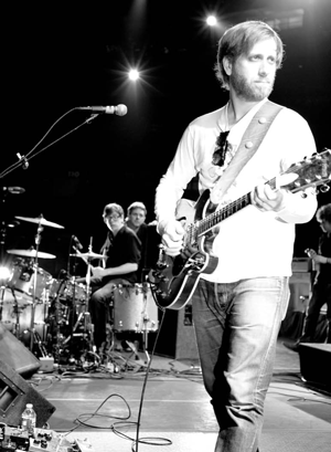 ![]() Auerbach and his Bigsby-equipped, three-pickup Harmony H77 onstage with drummer Patrick Carney. |