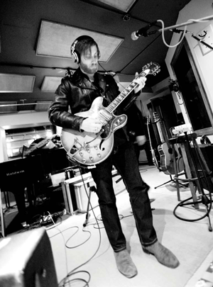 ![]() Donning cans and a biker jacket, Auerbach takes to the studio to wrangle riffs out of his Harmony H77. |