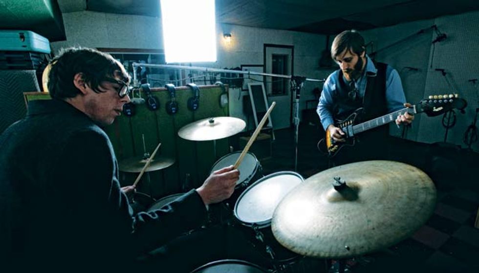 Dan Auerbach (right) wields his ancient three-pickup Supro (note the six on/off switches) while he and drummer Patrick Carney lay down tracks for the new Black Keys LP, Brothers.