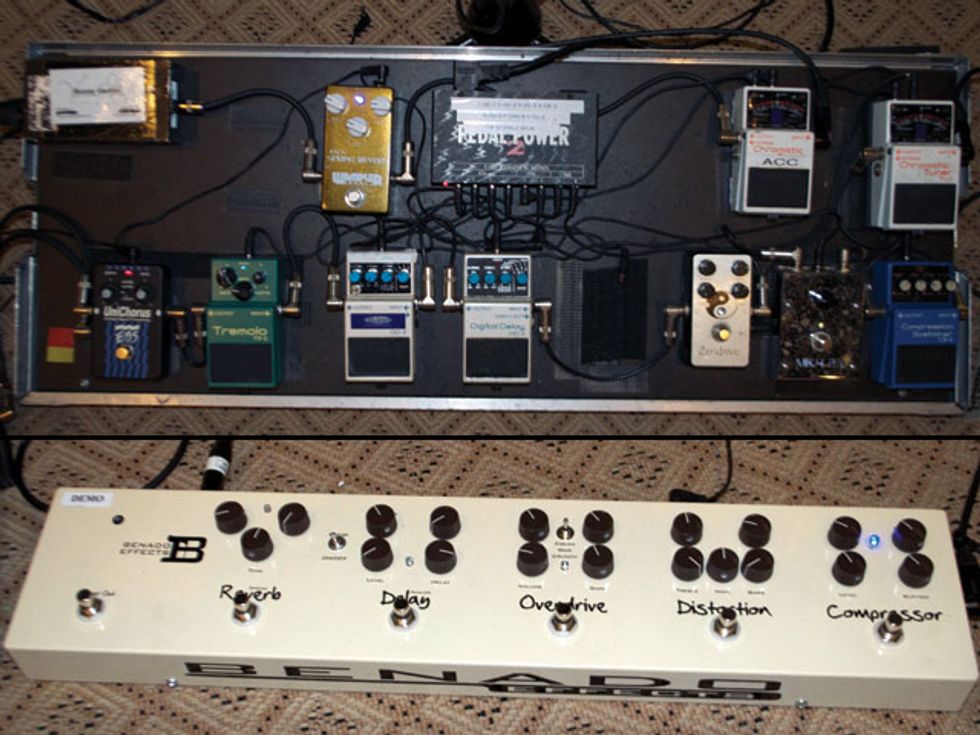 Zach loves his Sovtek Mig 60 head, which he plays through a cab he built himself at a pipe-organ shop in Denver. Every glue joint is lined with thin leather for maximum air tightness, and it’s stocked with Celestion G12M Greenback speakers.
